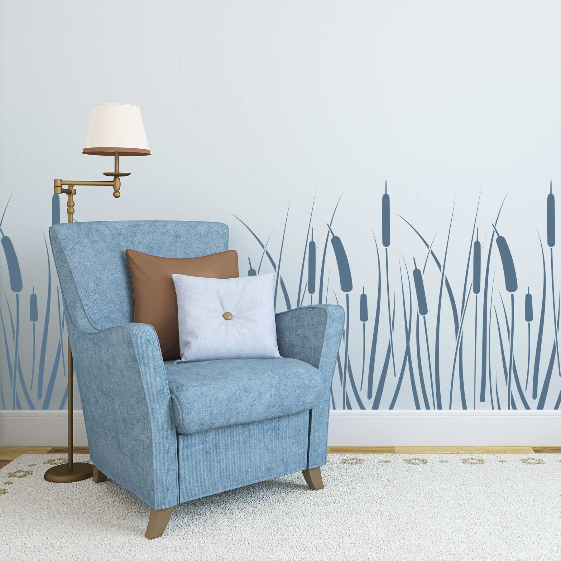 Our floral stencil, Bulrush/Cattail is a beautiful design for placement at the bottom of the wall. It also works very well 'growing' up a stairwell.
