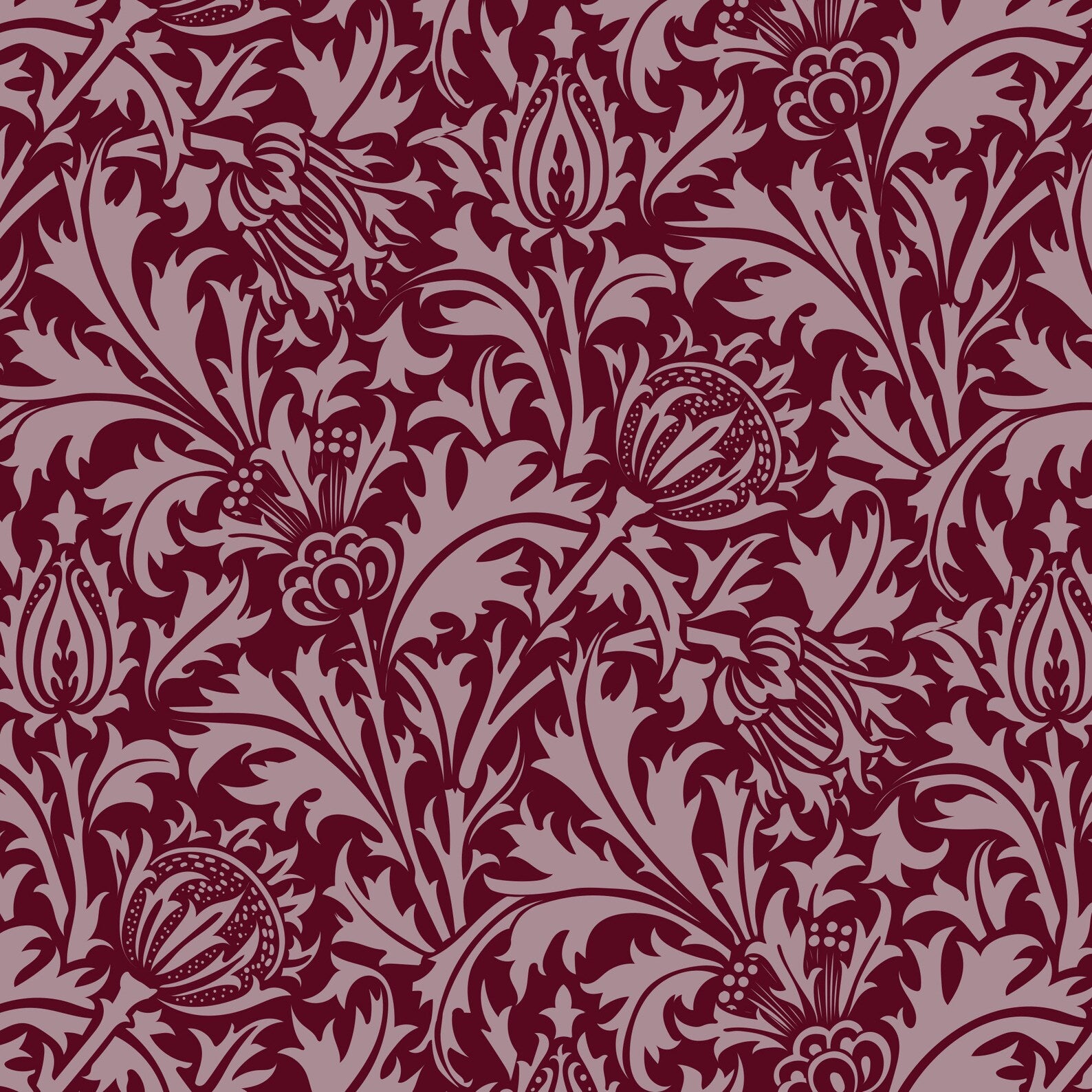 Designed by Morris & Co designer John Henry Dearle. Thistle is a beautiful floral repeating pattern. The flowers and leaves cascade down a wall with a beautiful effect. Perfect for a modern Arts & Crafts interior.