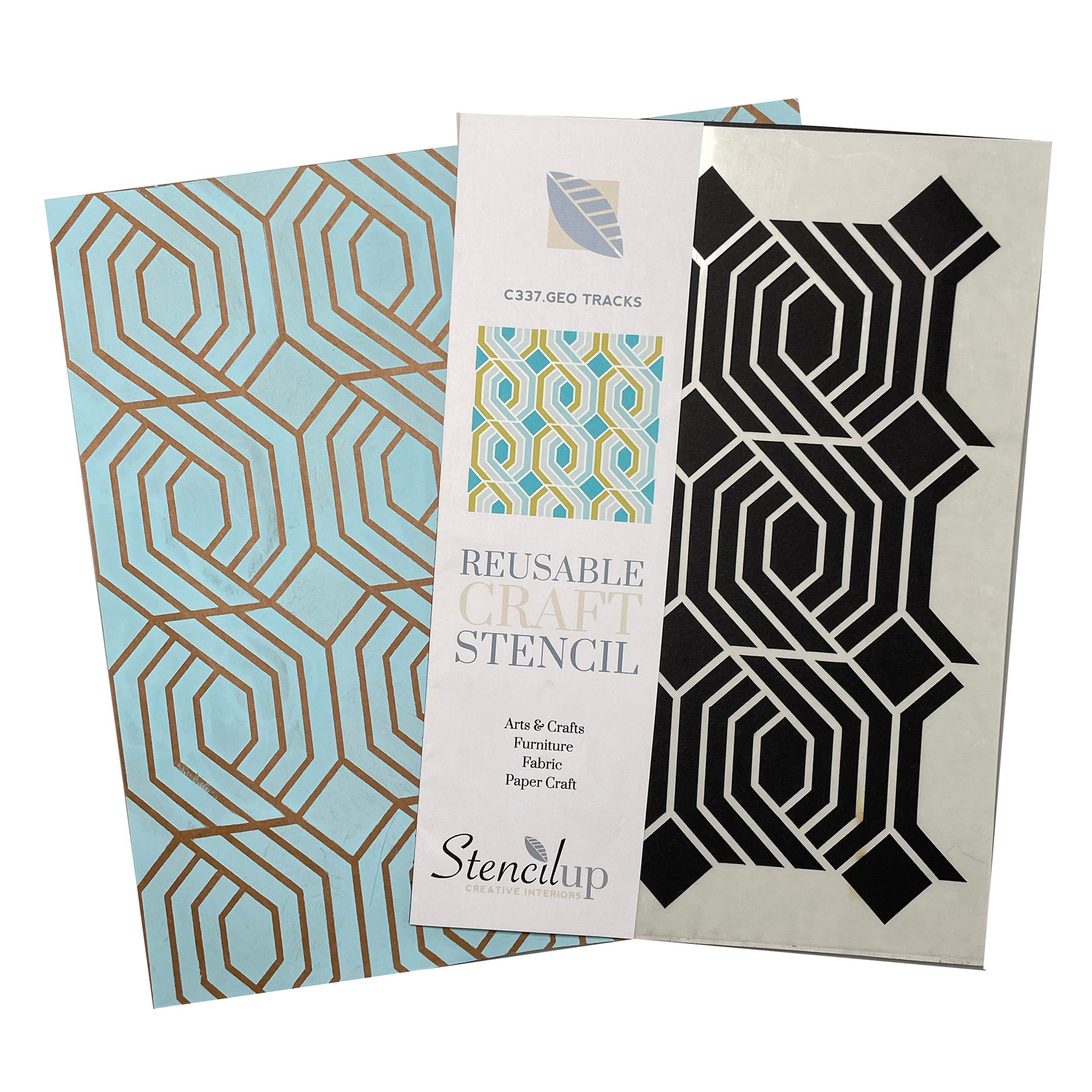 Geo Tracks is a mid-century modern stencil for painting. Reusable stencil for craft and furniture painting in a Retro pattern. Self adhesive stencil (option). This easy-to-use decorative stencil will transform your projects. A stylish geometric pattern.