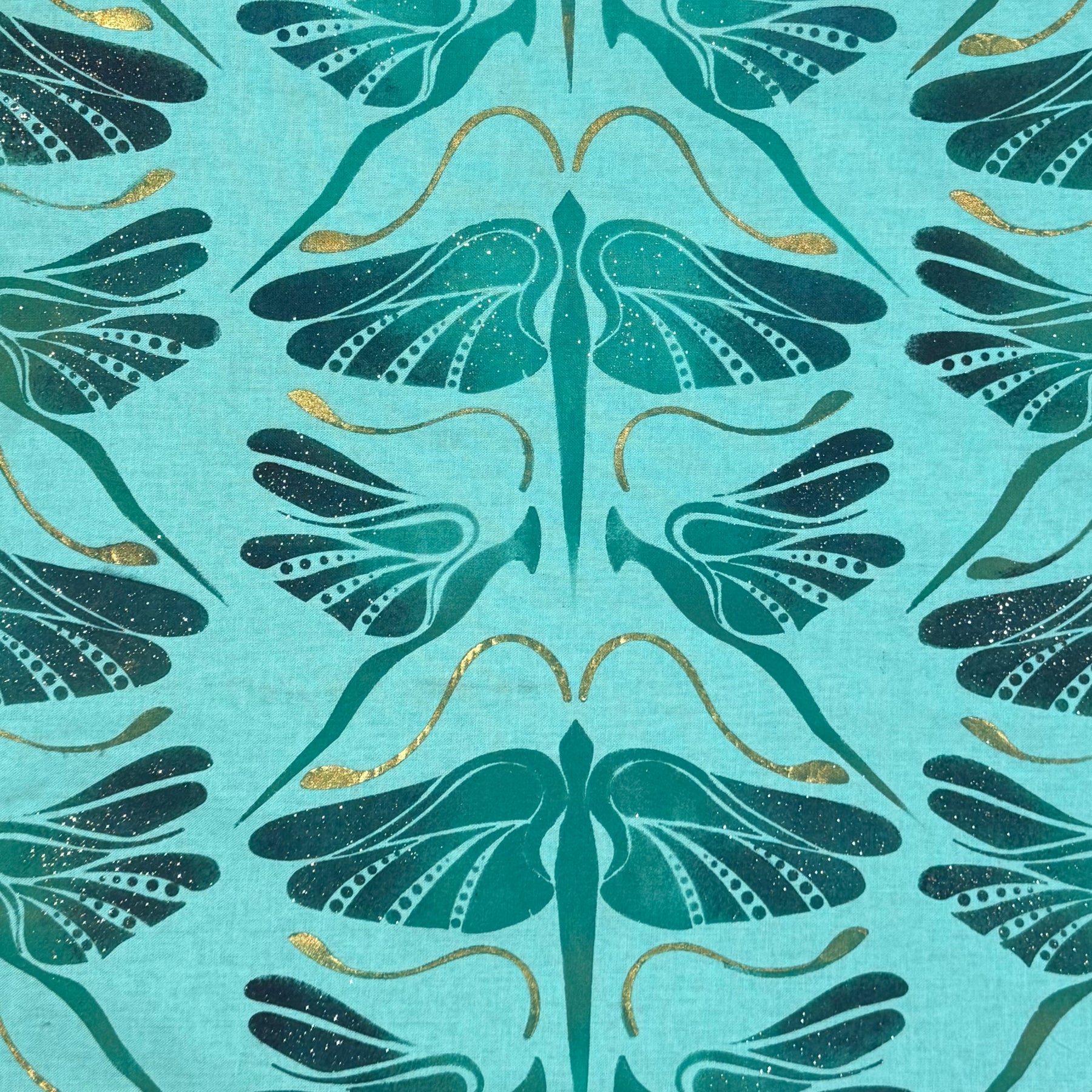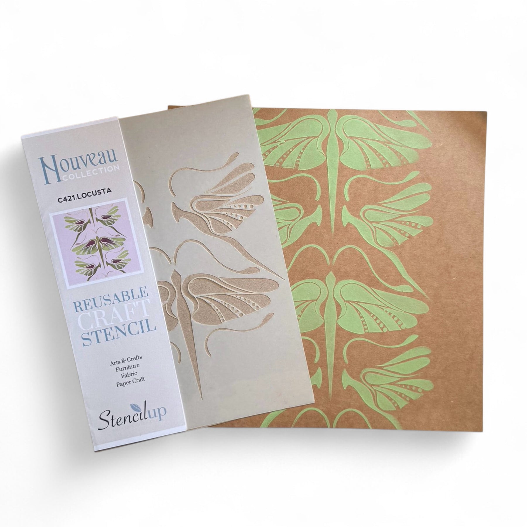 This detailed mylar stencil features a bold repeating pattern of stylised locusts, inspired by the flowing lines and organic forms of classic Art Nouveau design. Ideal for textile, fabric, and craft projects, the intricate pattern brings a unique, vintage touch to home décor, clothing, and accessories.