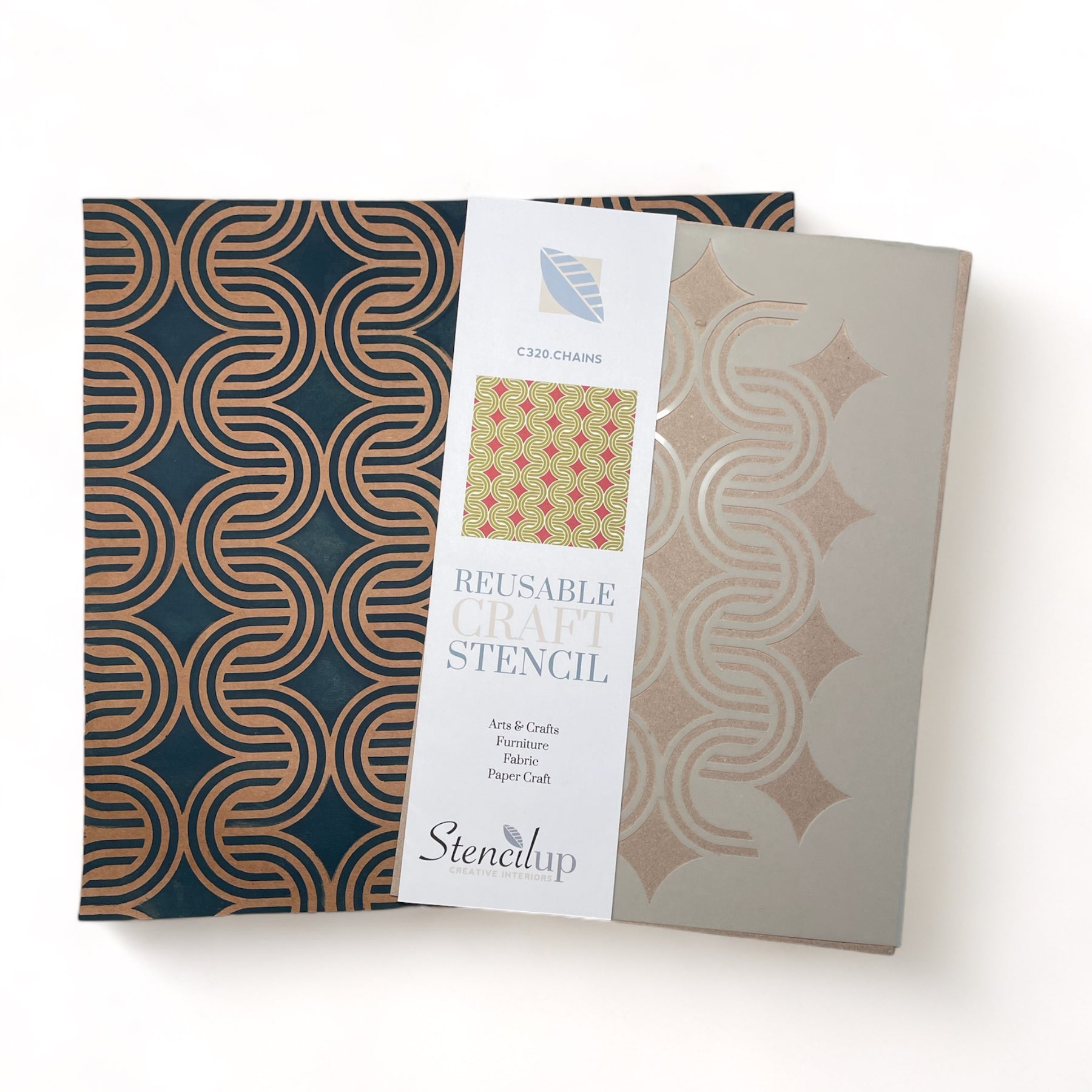 Retro Chains is a mid-century modern stencil for painting crafts and furniture. It is a reusable stencil for craft and furniture painting in a Retro pattern, with a self adhesive optional backing. This easy-to-use decorative stencil will transform your projects. A stylish geometric pattern.