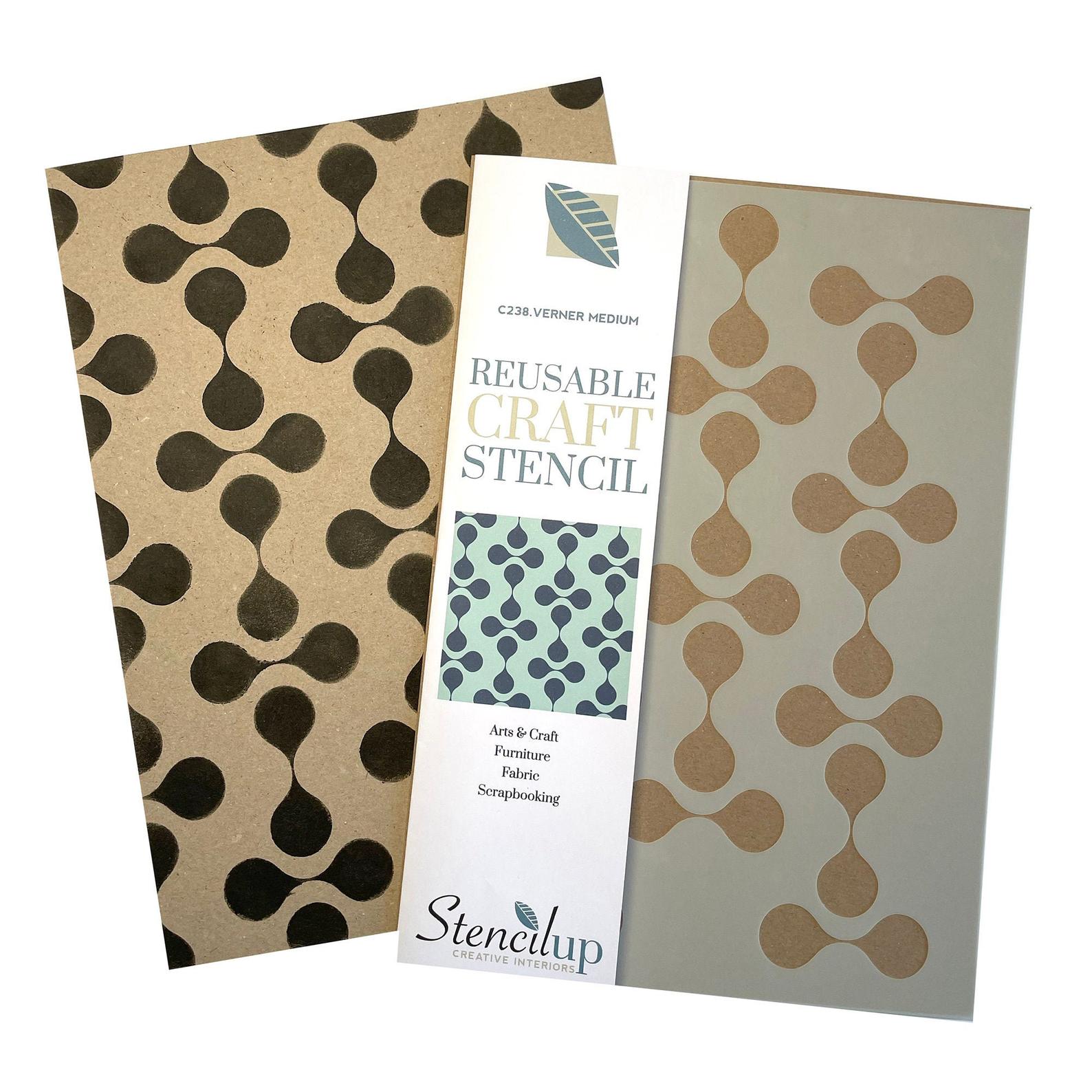 Mid Century Atomic geometric painting stencil. Reusable stencil for craft in a retro pattern. This geometric pattern furniture stencil is easy-to-use and is reusable. Perfect for upcycling furniture. Also available in a smaller pattern