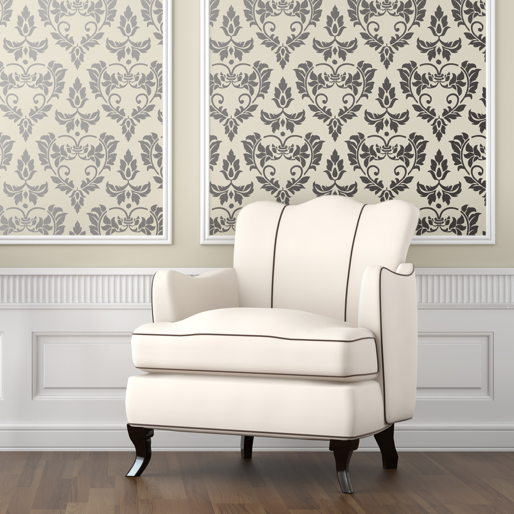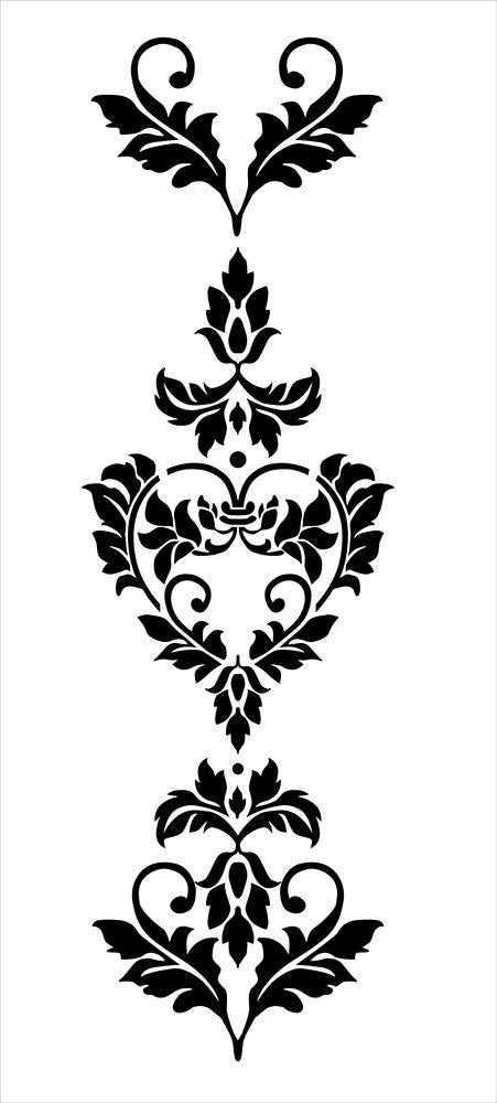 A traditional damask with a delicate heart at the centre. This large stencil will allow you to quickly finish a wall. Individual elements of the design work well on soft furnishings and furniture.