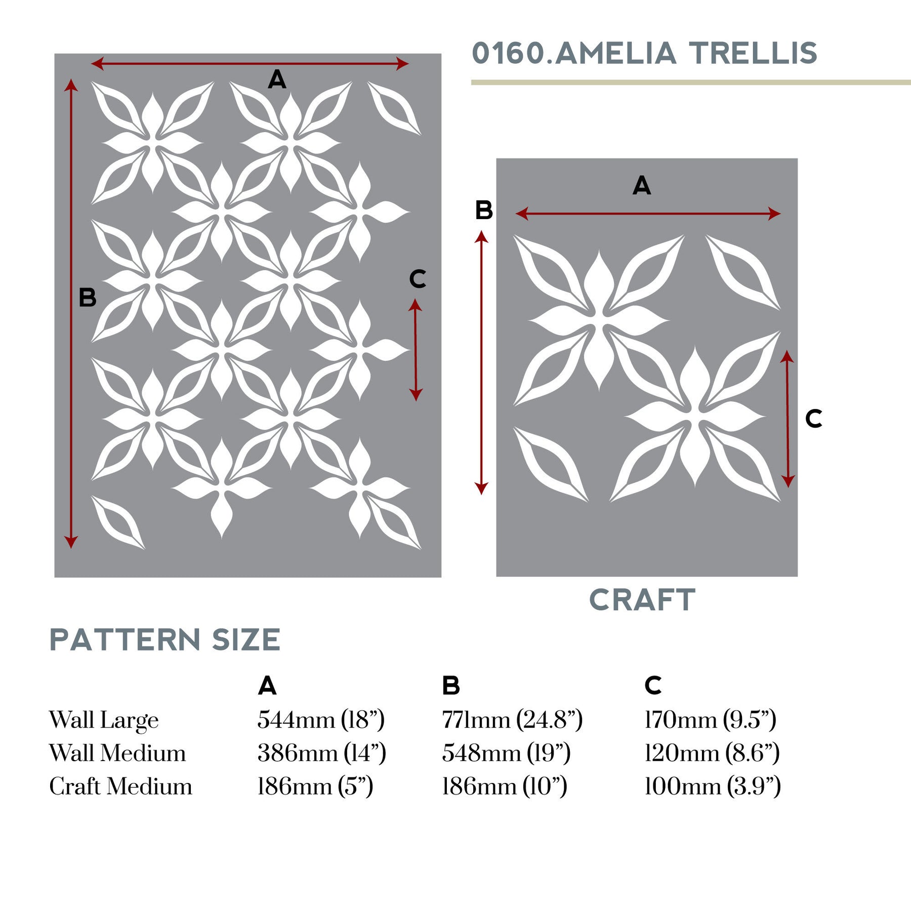 Amelia wall stencil is available as a single colour stencil, or, for easier multi colour applications, a 2-part stencil.