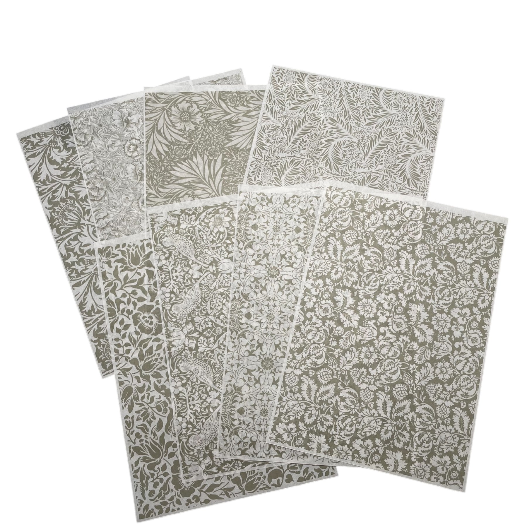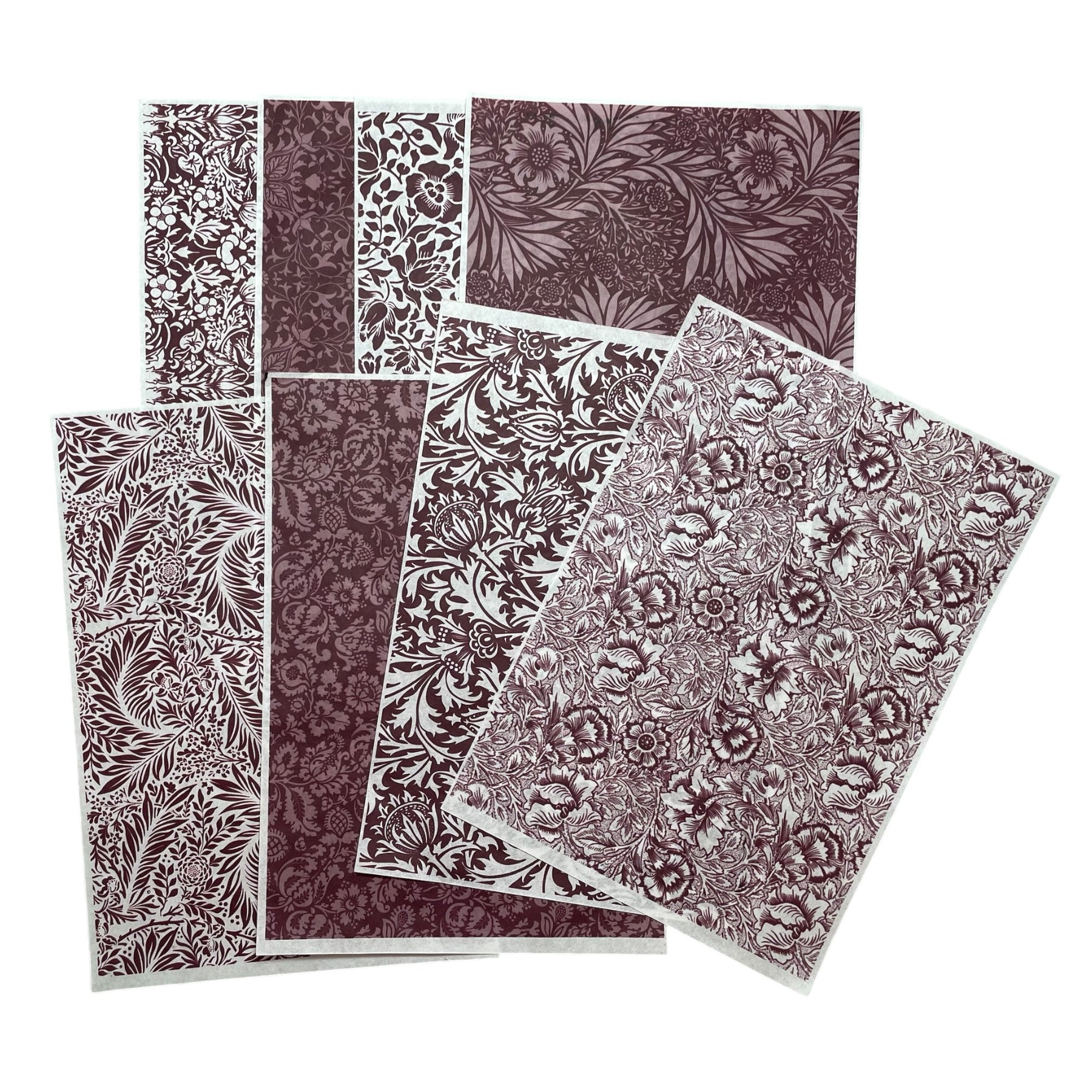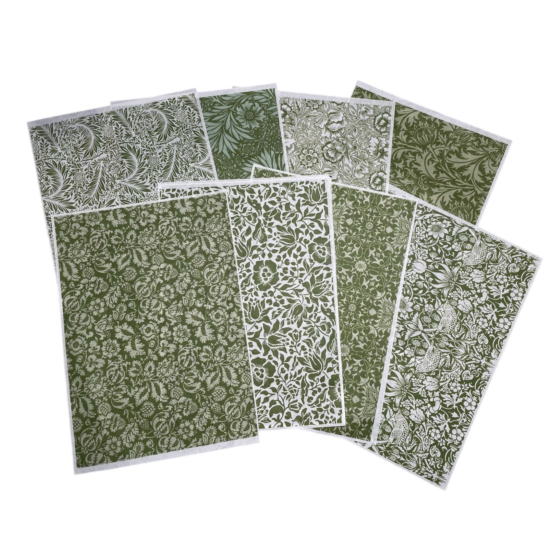 A beautiful set of 8 William Morris-inspired rice paper sheets, perfect for decoupage, scrapbooking, journaling, and other creative projects. Each design features classic floral and botanical patterns with rich colors and intricate details, bringing a touch of vintage charm to your work. Lightweight and easy to use, these papers blend seamlessly onto a variety of surfaces.