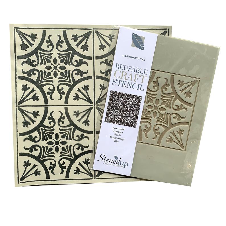 Benedict Tile Stencil - Minton Victorian tile design based on a tile at St Albans Cathedral in Hertfordshire. Tile design for painting. Use as a floor stencil tile or paint your patio. This craft stencil for furniture and floors is easy-to-use and can be used many times. Choose 'with grout' if you wish to create a tile effect on a flat surface. If you are painting on to existing tiles, choose the standard option.